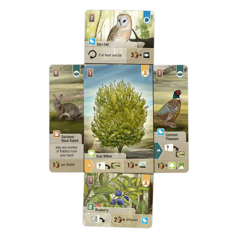 The game mechanics remain unchanged: You pick up two (beautifully illustrated, btw.) cards or play a card into your moorscape. Players compete in gathering the most valuable trees, shrubs and terrain cards - to attract species, thus creating an ecological balanced habitat for flora and fauna.