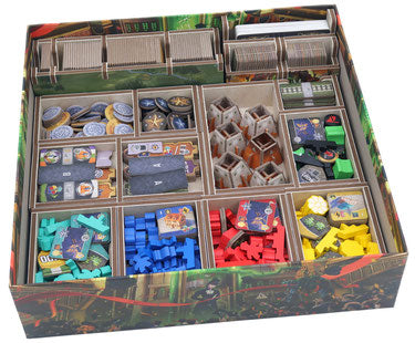 The design provides both efficient storage and improved game play. Many of the trays can be utilised during the game, and they greatly aid set-up and clear-away times. The rules and boards act as a lid on top of the trays.