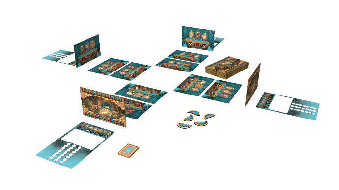 At the beginning of Temple Code, each player receives a combination card with a series of three unique statuettes that everyone can see but themselves. Each round, two combination cards are dealt face-up in front of each player. On your turn, pick a set of cards in front of another player, then take one for yourself and give them the other one. By aligning this card next to the one you're trying to guess, you will get hints about the matching statuettes: each blue circle indicates a statuette that is on both cards at the same place, and each orange triangle stands for a statuette that is on both cards, but in different positions.